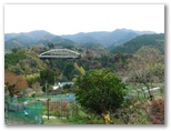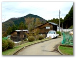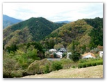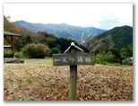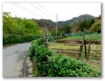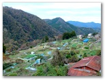 伏馬田城跡の山頂から左に階段を下り、「仁の丘農園」のわきに出ました。立派な東屋と休憩所があり、焼山から袖平山までの稜線を一望できます。農園自体も絵のような造りなので、休憩するのなら、山頂よりもここがお奨めです。春には桜もきれいに咲くでしょう。道志川に向かって右手前に見えるピラミッド形の山が、次に目指す521m峰です。その山名は分かりませんが、伏馬田城山と舟山の間にあり、国道413号からは、これら三山が三兄弟のように見えます。