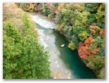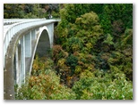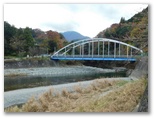 道志川に架かる亀見橋が見えてきました。そのたもとに「沿革」の石碑があるので読んで行きましょう。かつては、猿橋のような木橋だったとのこと。人々の思いが両岸から伸びて行き、中央でつながった瞬間が目に浮かびます。人々は大きな歓声を上げたことでしょう。現在は鉄筋コンクリートの美しいアーチ橋。橋の上からはアーチが見えませんが、渡り終えて振り返ると、なかなかの壮観です。橋の中ほどからは、道志川の深緑色の流れと、沿岸の紅葉を見下ろせました。