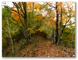石畳の道を登り詰めた先に庚申塔があり、気が付けば落ち葉を踏みながら歩いていました。右手に石砂山の双耳峰が見えるのですが、木々の枝葉が繁っているので、スッキリとは望めません。庚申塔から10分ほどで、東海自然歩道の分岐点にやって来ました。右は石砂山、左は菅井方面です。東丹沢登山詳細図に記されたアザミ平というのは、この辺りでしょうか? ここで私は菅井方面(西)に向かいます。紅葉と黄葉のきれいな道になりました。日が差さないかなあ!