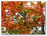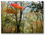 その先の踏み跡はずっと明瞭でした。この稜線は、よく歩かれているのでしょう。幾つ目かの小峰に、美しい黄葉のモミジが立っていました。地理院地図に記されている600m地点です。その先も起伏の緩やかな稜線が続いているのを見て、偵察はここまでとしました。天神峠に戻り、青根に向かって長い林道を歩きます。この林道は展望もなく、ひたすら我慢の道。大川原に近づくと、モダンな青根中学校の校舎や上野田大橋が見えるようになり、ようやくほっとしました。