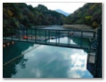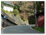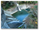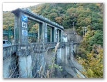 現在、国道413号は、青根交差点~平丸バス停間で通行止めです。西から来た車は、青根交差点で左折し、県道76号に進みます。私も歩いて、道志ダムに行きました。ダムに着いたときは、まだ午後3時前でしたが、すでに日は落ちて、紅葉も眠ったような色でした。しかし、昭和30年竣工の道志ダムは準レトロ調の装いで、小規模ながらも、古典建造物のような風格を感じました。ただ、発電力量が一般家庭77軒分というのですから、規模としては可愛らしいものです。