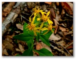 菅井の峠に戻り、[峰山・青根] 方面へと東海自然歩道を気楽に歩いて行きました。すぐに峰山への道を右に分けます。その先も、遊歩道のようによく整備された道が続いたのですが、やがて倒木が目立つようになりました。501m峰と587m峰(舟山)の鞍部で、綱子方面への踏み跡を右に分けます。ここから先、東海自然歩道が舟山の北面を巻く区間には、おびただしい倒木がありました。9月30日の台風24号による爪痕です。舟山登頂も、きっぱりとやめることにしました。