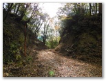 ここから菅井までの区間は、5年前の春に歩いたことがあるのですが、思い出せたものは何もありませんでした。左手には、木々の枝を透かして伏馬田城山(仮称)が見え、右手のゴルフ場の向うには、石砂山西峰の北稜を望めます。いずれも、なかなかスッキリとは望めません。長い笹尾根の一部を望めるところがあり、雲の隙間から落ちた光が、一部分だけを明るく照らしていました。ここはしばらく平坦な道が続きます。ほどなく伏馬田城跡への分岐点が見えてきました。
