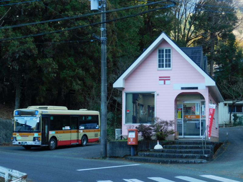 -- 津久井青根簡易郵便局と三ケ木行きバス。