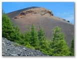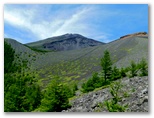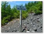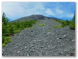 「三合」で「宝永第三火口」への道を右に分けます。森林はカラマツがメインですが、その背丈がずいぶんと低くなりました。山に引き寄せられるように登り続けます。三合から20分ほどで、樹間に山頂が見えました。一気に元気が倍増します。さらに「三合五勺」に至ると、パッと前方が開けました。この辺りが森林限界でしょう。登山歩道の幅が広くなり、スコリアの道が山頂に真っ直ぐ続くかのように見えます。道の中心に、白いコースロープが置かれています。