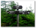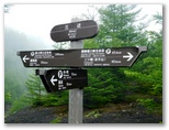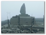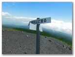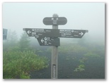 しばらく歩き続けると、ファンタジックな気分がしてきました。自分一人しか登場人物のいない物語の中にいるようです。大きな富士山の中腹での夢漫歩。辺りに生える幾多のフジアザミは、未だつぼみをのぞかせるだけ。時の経過を忘れた旅人のように、ただ標柱と本能が示す方向に歩き続けました。やがて霧の中からフェードインしたのは、「二ツ塚分岐」の道標。右手の下塚に登ります。視界は濃霧と強風ばかりでしたが、頂上の「日本人の始祖」の碑は見えました。