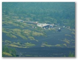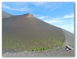 ベニイタドリやオンタデのパッチ(島状の群落)がたくさん現れました。ヤマホタルブクロが咲いています(下界にもあるけど)。真っ青な大空に、薄く引き伸ばしたような雲。正面は富士山頂、右手に宝永山。パワー全開でぐんぐん登り、「四合」(山体観測装置)に到着しました。きょうの目的地です。今、目の前に、宝永第一火口と宝永第二火口の壮大な空間。近過ぎて、デジカメを広角端にしても収まりません。簡単に登れたにしては、とても大きなご褒美です。