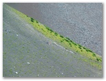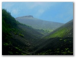 昼食を終え、再び急なザレを下ります。緊張しますが、大した距離ではありません。小鞍部に着くと、宝永第一火口と宝永第二火口とを、改めてしっかりと目に焼き付けました。「それではまた来る日まで」、とつぶやきます。この小鞍部から先は、宝永第三火口のすり鉢斜面に付けられたトラバース道を、緩やかに下っていきます。宝永第三火口の底は、下方に見える森林限界のすぐ上あたりでしょう。大きなすり鉢に点在するオンタデのパッチが童話の絵のようです。