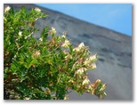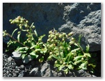 「四合」に戻ります。宝永第二火口の下縁、小鞍部に道標が見えます。四合からその地点に向かって急傾斜のザレ道を下っていくと、大きな岩が程よい日陰をつくっていました。イワオウギの花が咲き、マルハナバチ、シジミチョウ、ツマグロヒョウモンなどがいて、いい感じです。ここで腰を下ろし、食事にしました。眺望は抜群。富士山屈指の優美な空間と言えるかもしれません。大岩が強風を遮り、何とも平和なランチタイム。極上の休憩所ですが、定員は最大2名です。