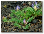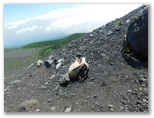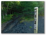 三合(御殿庭中)で、今朝歩いた須山口登山歩道に合わさります。ここからは少々荒れたきつい下りなので、足元をしっかり見ていかなくてはなりません。キョロキョロ花虫探索どころではなかったのです。そこで計画を変更し、二ツ塚経由、「御殿場口新五合目」を新ゴールとしました。「二合五勺」(御殿庭下)で須山口登山歩道と別れます。ここから「御殿庭入口」への道は、等高線とほぼ平行。その先もアップダウンは緩やかで、疲れた足にもやさしそうな道でした。