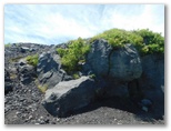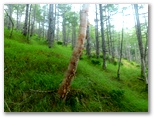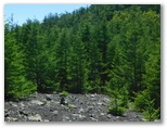 さて、この「須山口登山歩道」に対して、「須山口下山歩道」もあります。富士宮ルートを除く、他の3ルートと同様です。それで私は「下山歩道」ではなく、「登山歩道」を登って御殿庭に行こうと計画してきました。道標を見ると「御殿庭105分」となっています。いざ出発すると、始めから鬱蒼とした自然林で、涼しく、静かで、いい感じです。ただ、土は乏しく、火山らしい、ゴロゴロした岩石を踏んで歩く道です。要所要所に目印の赤テープがありました。