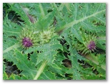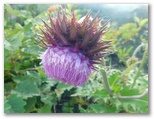 その後もあまりに風が強くて歩き難いので、右手、砂礫の谷道に降りてみると、受ける風が弱くなりました。強風時はお奨めです。幕岩からの道を右から合わせると、もうゴールは間近。16時50分、御殿場口新五合目の駐車場に到着しました。さっそくトイレに行きます。節水のために絞られてはいますが、ありがたくも水が出ました。手を洗うには十分です。外に出ると、紫色の大きな花、フジアザミが咲いていました。謙虚そうに大きな頭を下げる姿が、私は好きです。