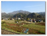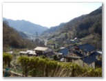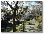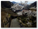 登山道の終点、パッと視界が開け、田野や初鹿野の集落を望めるところは、とても楽しみです。今回は、初めて桜が咲いていました。景徳院にも桜が見えます。期待に胸をときめかせつつも、民家の庭先を遠慮がちに通らせてもらい、田野の車道に下り立ちました。そして桜満開の景徳院へ。今わずかに散り始めたばかり、まるで絵画そのもののような山門にゴールインしました。バスが来るまでの時間、桜咲く禅寺の美しい庭を、心行くまで味わいました。