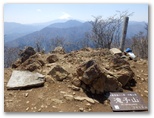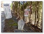 曲り沢峠に来た途端、北西の谷から吹き上げる強い風に見舞われました。ここからオッ立に登るのですが、道が分からないので、斜面を適当に登ります。凄まじい横風を受け、帽子を押さえますが、高低差はせいぜい30mほど。あっという間に登頂してしまいました。新旧二つの山頂標が立っています。平成八年十月、大和村と書かれた白い標柱が、新品のようにきれいなのが印象的です。いずれの標柱も、頭に防水用の金属冠をかぶせてありました。滝子山のもお願いします。