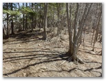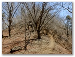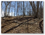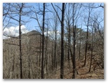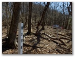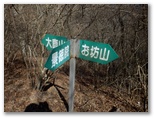 オッ立山頂からは、滝子山、浜立尾根、お坊山と東峰などが、冬枯れの季節限定で望めました。山頂から南に延びる、太い尾根に進まないようにしましょう。縦走路へは、西北西の尾根を下ります。ここも道がないので、適当に下って行くと、右からの縦走路と出合いました。すぐ先の鞍部で景徳院への道を右に分けますが、足跡をつなぐために、ここは見送ります。目指す大鹿山は目の前の低いピークで、高低差は20m程度。これまた道が分からないので適当に登りました。