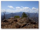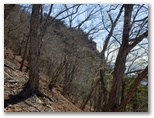 そこから5分ほど登ると、大きな岩が立ちはだかっていました。ホールドが多いので、普通に登れそうです。でも左側に赤テープがあったので、迷わず左を巻きました。その後も寂惝尾根に似た岩稜が所々に見られ、赤テープのある場合はそれを追って行きました。右手を見やると、山麓から望んだ、あの断崖が目の高さです。そして、大岩から約15分で、東西方向に延びる尾根に立ちました。西方へは通せんぼがしてあります。この尾根を東へ5分歩いたら、浜立山の山頂でした。