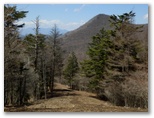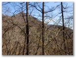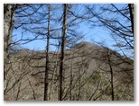 「難路」と「迂回路」の分岐点から「迂回路」に進みます。少し登り返すと、あとはずっと平坦な道。左手に滝子山と浜立尾根が、まだ葉のないカラマツ越しに望めます。三ツ峠のアンテナ群が、白い富士山をバックに影絵になって、少しずつ左に移動して行きました。笹子駅への道を左に分け、相変らずウソのように楽な登山道を進みます。アブラチャンの群落があり、何度も撮影しましたが、全部ピンボケNG。そして左前方にオッ立が見えると、すぐに曲り沢峠でした。