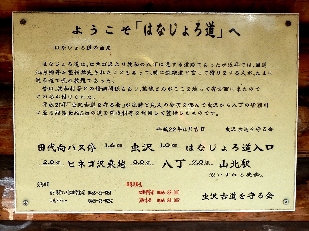「はなじょろ道」は「花嫁の道」の意。現在の松田町の虫沢地区と、山北町の八丁地区を結ぶ山越えルートで、虫沢古道を守る会の方々により、ハイキングコースとしてよく整備されています。