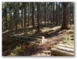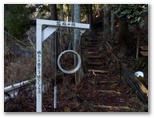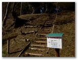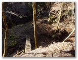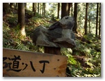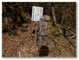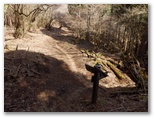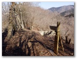 花嫁の鐘から40分ほどで、ヒネゴ沢に架かる木橋を渡ります。そこに炭焼き窯跡がありますが、これを見せるために木橋を架けたのかも知れません。すぐ上の木橋でまた左岸に戻ります。このとき、ピンクのテープに誘われて、真っ直ぐ沢を詰め上げる踏み跡に入りそうになりました。木橋を塞ぐ倒木が、通せんぼのように見えるのも一因ですが、これを跨いで越えるのが正解です。そして10分ほど山道を登ると、ヒネゴ沢乗越でした。