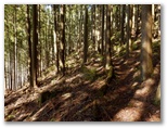 富士見台で左折し、人遠尾根に進みます。道標が「高杉入口方面」を指す方向です。この先、県道に下り立つまで道標はありません。はなじょろ道とは打って変わった、薄い踏み跡をたどって、やや急な斜面を下ります。でもすぐに、なだらかな尾根歩きになるので、ここは心配ありません。倒木がたくさんあり、たいていは北向きに倒れています。これらを迂回しながらも、尾根を外さないように注意を払いながら進んで行きました。