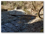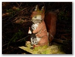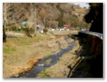 同じ道を3回も歩き、はなじょろ道入口にやって来ました。可愛い木彫の仔鹿と仔熊が出迎えてくれます。両方とも紐で縛られているのは、とられないためでしょう。川原に下り、木橋を渡ります。川原の岩に腰を下ろして、ちょっと遅い昼食にしました。堰堤の右岸に魚道がありますが、魚影はありません。ぽかぽか日和の清流で手と顔を洗い、やや疲れた足を初めて休めました。