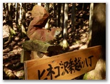 「詳細図」では、虫沢からヒネゴ沢乗越までを「はなじょろ道東コース」としています。ヒネゴ沢の左岸によく整備された登山道が付けられ、道標が完備、危ない箇所もありません。道には杉や檜の落ち葉が堆積し、前日の雨を吸い込んで膨れたのか、多くの箇所でふかふかしていました。ただ展望はありません。単調と言えば単調です。所々に置かれたチェーンソーアートのウサギやリス、それと標高50mごとに置かれたミニ標識が、その単調さを救っています。
