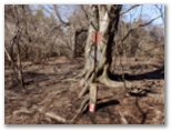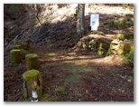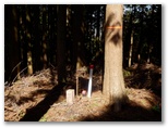 ここにはピンクや空色のリボンが結ばれ、しかも杖のような枝が2本立てられていました。明らかに重要ポイントです。鹿柵はここで右に折れて行きました。後で反省すると、ここで鹿柵に沿って右の尾根に進めばよかったのではないかと思います。私はこのとき、地理院地図を見ていて、小峰から南に分岐する道を探していました。そして次の石柱三号で南に分岐する道を見つけ、そこが小峰でないのはちょっと変だな、と思いながらも、これでよかったと思い込んでいました。