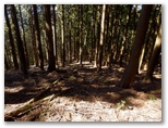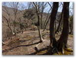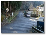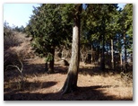 この仕事道は途中でなくなりました。そこにツバキの木があります。踏み跡が下へと続いていますが、県道は川の向こう側。川原に下りようかとも思いましたが、その先が不明です。下降を始めた地点まで仕事道を戻り、1本北の尾根までトラバースしました。幸い難なく北の尾根に移動でき、しかもその尾根には、よく歩かれたような道がありました。この道を元気よく下り、右の小沢を越えて、さらにもう1本北の尾根を巻いて行くと、ようやく県道に出ることができました。