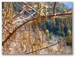 新松田駅で乗った寄行きの始発バスはガラガラでした。これでは全く不採算ですが、これから通勤通学客を迎えに行くバスなのかも知れません。田代向(たしろむかい)で下車すると、中津川に架かる田代橋を渡ります。橋の上から、うす雪の残る鍋割山稜を望めました。昨日の雨は、塔ノ岳や蛭ヶ岳では雪だったでしょうが、これから行くはなじょろ道と高松山はどうだったでしょうか。春を促す雨になったかも知れません。適度に潤った朝の空気が顔に心地よく感じます。