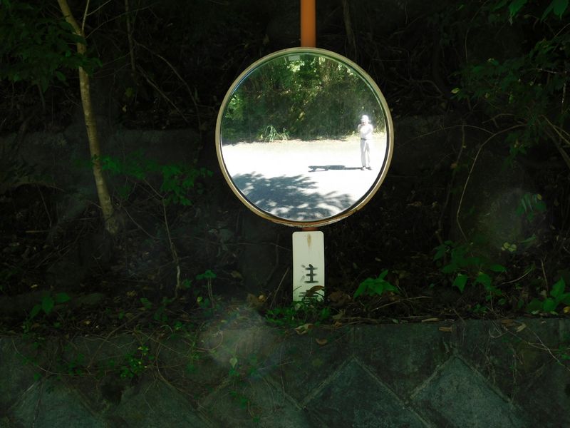 -- 石垣より先に設置されたカーブミラー。