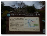 「朝晩は曇り、日中は晴れ」と予報されていたので、遅めに出発しました。坂尻でバスを降りたのが、9時23分。まだ曇っていました。里にまだ咲いているのは、八重桜。バス停の横に立っている「関東ふれあいの道」の案内板を見て、法論堂川(おろんどがわ)沿いの道に進みます。少し行くと、木製の道標がありました。「旧宮ヶ瀬線」の文字を確認し、左に分岐するヘアピン状の坂道を上ります。この時、小キジを我慢していたのですが、いい具合にトイレがありました。