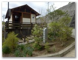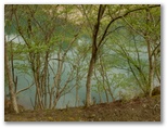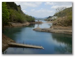 道標に従い、土山峠方面に進みます。ベンチの二つある休憩所がありますが、ここが旧土山峠でしょう。みやがせ道は、あっけなく終わってしまいましたが、これで三角形の一辺を歩いたことになります。さらに進んで階段道を下り、県道を2分ほど歩いて、現在の土山峠に到着。ここは辺室山の登山口で、バス停があります。坐禅石の脇を通って湖畔に下り、準備運動をしました。ここは大文字形の宮ヶ瀬湖の南端の一つで、細長い人造湖を一直線に見渡すことができます。