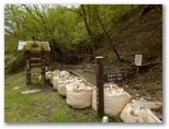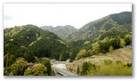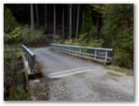 これより未完成の村道に入ります。土山峠の北西約300m、虫垂のように突き出た岬がありますが、これが目指す堤川左岸尾根の下端です。この尾根を登って宮ヶ瀬尾根に至る計画ですが、どう取り付けばよいのでしょうか? 通行可能なルートが見つかればいいのですが、さもなければ、きょうは偵察のみ、ということになります。土山峠から村道を進み、最初の橋を仮に1号橋と呼びますが、3号橋のすぐ手前に作業用径路の入口があるので、まずここから入ってみます。