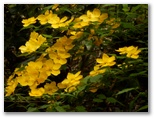 みやがせ道は、県道64号とほぼ並行して、北西の宮ヶ瀬に向かっています。左右は杉林だったり、草原だったり、混交林だったりと、ほどほどの変化がありました。山道ですが、登山道よりも幅広で、二人並んで歩いてもゆとりがあります。かつて、人馬や荷車の往来が普通にあったのでしょう。今はひっそりと、古道っぽい雰囲気。道のわきには、ミミガタテンナンショウとヤマブキが目立ちました。やがて左手の空が明るくなり、仏果山登山道と斜めに接続しました。