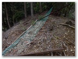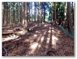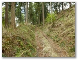 森林作業をしていた若い男性が近づいてきました。「どちらへ?」と尋ねられたので、「できれば坂尻へ行きたいのですが」と答えると、「この道を行くと、水道施設に行けますよ」と、夢のような言葉。「本当ですか、ありがとうございます」と私。この若者は終始にこやかでした。きっと私の願っていたことを知っていて、声をかけてくれたのでしょう。その作業道は、最近造られたばかりのジグザグ道。黒い土が盛られて、高級じゅうたんよりもフカフカでした。
