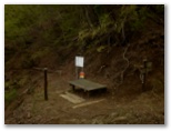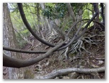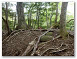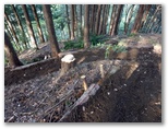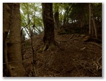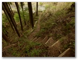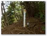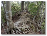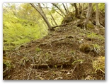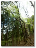 登って行くと、朽ちて斜面と同化した階段がありました。ルートの選定としては概ね妥当だったようですが、こんな階段は全く足場になりません。下を振り返ると、すごい急傾斜。万一滑落したら、どこでどうしたら止まれるかも考えておきます。何も手がかりのない場所では、四駆(両手両足)モードでヤモリのように、斜面にへばり付いて登って行きました。ドライバーは持って来ませんでしたが、腐葉土の地面が緩いので、あってもあまり役に立たなかったでしょう。