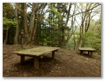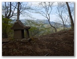 小さな石祠のある、辺室山・物見峠の分岐にやって来ました。休憩の好適地なので、ここで腰を下ろしてお茶にします。おやつの一口ドーナツで、糖分を補給。ここで、三角形の第三辺をどのルートにするか、思案しました。当初は、唐沢林道を少し下って、途中から辺室林道を歩いて坂尻に至るつもりでしたが、少し冒険が過ぎるような気がします。森ノ岳経由で坂尻へ行く道は、より安全だけれども、つまらなさそう。最終判断は、ここでしておきたいと思いました。