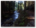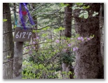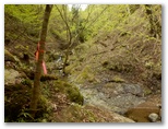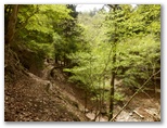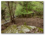 入り口に、「行き止まり、危険箇所があるので、関係者以外立入禁止」と書かれています。ありゃ、ダメか、と思いましたが、「行き止まらなければよい、危険箇所を避ければよい」と屁理屈をこねて、「ちょっとだけ見せてください」と言いながら入って行きました。とはいえ、うしろめたい気持ちがします。でも谷間に溢れる緑、さらさら流れる清流の音に引き込まれて、次第に深入りしてしまいそう。もうここでやめようと思った時、赤テープがありました。