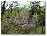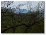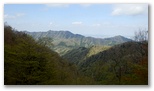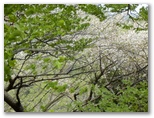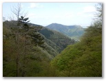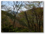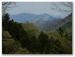 坂道を上り切ると、俄然見晴らしがよくなりました。山々は濃淡さまざまな緑のパッチワーク。極薄ピンクのヤマザクラがアクセントを添えています。西方にデンと伏せた、大きい山が辺室山。これからこの山の周囲を、半時計回りに1周します。南に望む形の整った山は、鐘ヶ嶽でしょう。きょうは眺望を期待せずに来たのですが、このみやがせ道からのパノラマは、思わぬプレゼントでした。でも空が青かったらもっときれいだろうにと、つい欲が湧いてしまいます。