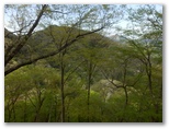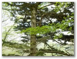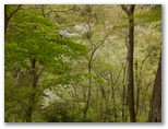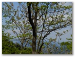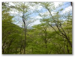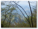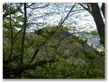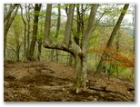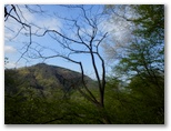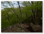 標高530m地点に腰を下ろせる岩場があったので、リュックを下ろして昼食にしました。熱いお茶を飲み、落ち着いて周囲を見回すと、美しい樹木がたくさん。いや、どの木もみな美しく見えます。四季を人生に喩えれば、新緑は青春時代。青年たちと付き合うと元気をもらえるように、今は山に若々しいエネルギーが充満しています。思い切りその生気を吸い込みながら、いいところだなあ、と一人で悦に入っていました。でもここを人にお奨めできるかな? まだ分りません。