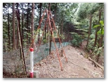 さて、堤川左岸尾根にも丹沢名物の鹿柵(植生保護柵)が縦横に設置されていました。柵越え用に橙色の鉄製脚立があるのですが、不安定な脚立に乗るのは怖いもの。動物が開けたか、人が開けたか判らない抜け穴もありますが、いずれにせよ柵の右を行くべきか、左を行くべきか、悩ましい判断を迫られます。鹿戸(扉)があればいいのですが、尾根上の鹿戸は、1箇所しかありませんでした。結局、カンで判断して行きましたが、幸い何とか柵地帯を抜けることができました。