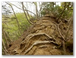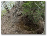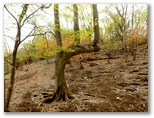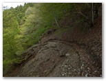 赤テープの先で、作業用径路は対岸に続いていました。探索はここできっぱりと中止。さて、現在地の東の尾根が、堤川左岸尾根です。見上げると、まだ大して高くはないので、ここから尾根に乗ることにしました。あまり高低差が大きくなると、上の方が見通せず、無理に見切り発車をすると、最悪の場合、どこか途中で進退窮まることになりかねません。行く手の岩や、立ち木などを見てルートを決め、グズグズ気味の斜面に取り付きました。