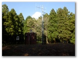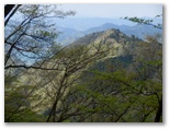 危険地帯の約800mを通り抜けると一安心。左手に、新緑とヤマザクラが美しい辺室山を望めました。この道では、色鮮やかな紅葉の辺室山を見たこともあります。辺室山が見えなくなると、間もなく三峰山登山道に合流。さらに7分ほど下って煤ヶ谷への道を右に分け、森ノ岳へと向かいました。印刷してきた地図を見ます。尾根を正しく選ぶのが勝敗の分かれ目。雨量観測施設のある森ノ岳山頂までは、全く問題ありません。ところが、そこから予想外の展開となりました。
