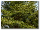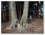 尾根の詰めに入ります。急登に喘ぎますが、危険個所はなく、ひたすら頑張るだけで登り切りました。そこは標高600m+、宮ヶ瀬尾根への接続点で、白杭に「大岩のピーク」と落書きがあります。ご神木のような風格を持つ樅の木にタッチ。南へ続くヤセ尾根で、鹿柵と立木との狭い隙間を、カヤの固い葉にチクチク刺されながら通過しました。でもその後は尾根幅が広がります。ところで、緊急時はP597の南方約200mから、南東の尾根を経由して、堤川林道に下りられます。