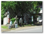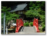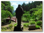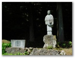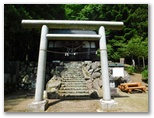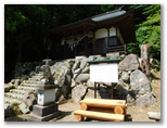 さらに西へ10分ほど歩くと、左手に赤い欄干の橋と、雛鶴神社が見えてきました。境内は狭いのですが、立派な石鳥居と、小ぎれいな拝殿があります。ハイカーのためか、うれしい木製テーブルとベンチも。そこに立つ由緒書きを読むと、姫と赤ちゃんが亡くなったのは、無生野としか書いてありません。ただ、姫が葬られたという「東がひと眺めできる橋のそば」(秋山の民話[41])は、この神社の境内かも知れません。今「雛鶴姫之像」が東を向いて立っています。