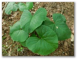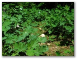 その「ハイキングコース」のはじめは、杉の落ち葉でフカフカの道でした。すぐに明るく開けた場所に出ましたが、そこに送電鉄塔があり、秋山山稜と秋山二十六夜山を望めました。帰宅後に調べると、送電線は都留線、鉄塔は110号です。送電線の下は、高い樹木が伐採されるので、展望が利きます。さらに進むと、タケニグサが道を覆っているところがあり、その中からヤマドリが3羽、次々と飛び出しました。このあたりは禁猟区のようです。ところで熊さんは ...?