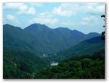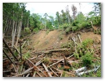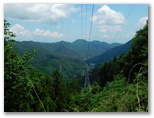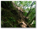 最後にもう一度、109号鉄塔下から、秋山山稜と無生野の里を望めます。そしてここから、普通の登山道になりました。明るい左手は急峻に落ちる谷で、トラロープが張られています。眼下にリニア施設が見え隠れするので、身を乗り出さないよう牽制するためでしょう。歩行の補助ロープなら、山側に張ります。道志の山なみの一部も見えてきました。リニア施設の傍を流れる大旅川。その源頭あたりに並ぶ峰々の最高峰が、朝日山(地理院地図の赤鞍ヶ岳)でしょう。