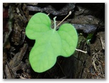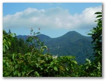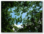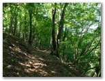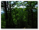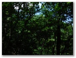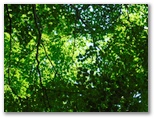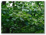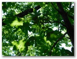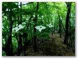 鞍部に下りて、楢峠を通過。行く手の樹木を透かして、高畑山の輪郭が見えました。ここから高畑山へ、最後の登りです。山と高原地図(高尾・陣馬 2014)に、「ヤブあり」と書いてありますが、ヤブはありませんでした。蝶も花もありませんが、空を見上げると、たくさんの葉が重なり合い、透過する緑の光がとてもきれいです。中でもカツラの円い葉の作品は金賞もの。どこかで鳴くツツドリの声「ホホー ホホー」を聞きつつ軽快に登り、雛鶴分岐に到着しました。