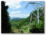 雛鶴峠は涼しくて、ひと息付ける場所です。でもどこか荒涼とした雰囲気があり、長居したい場所ではありませんでした。直ぐに高畑山に向かいます。緑陰下によく整った幅広の楽チン道は、送電線巡視路でしょう。雛鶴峠からわずか3分で、都留線109号鉄塔に至りました。道は鉄塔の真下を通っています。ここも好展望地で、今倉山以西の道志山塊、三ツ峠山~本社ヶ丸~鶴ヶ鳥屋山、その手前に九鬼山、右遠方に笹子雁ヶ腹摺山と滝子山まで望めました。