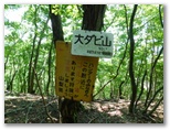 鉄塔から20分ほどで、高岩に到着しました。でもここに高い岩が立っている訳ではありません。遠方から眺めると、ここが高い岩峰に見えるのでしょうか。高岩から少し下った鞍部が、イヤゲ峠。古びた「発砲禁止」の標識と、もっと古びた「発砲注意」の標識とがあります。古い方は取り外せばよかったのに。イヤゲ峠から10分ほど登って、大ダビ山(901m)。正午のメロディーを風に聞きながら到着しました。大旅川の同族でしょうか。ここでおやつ休憩にします。